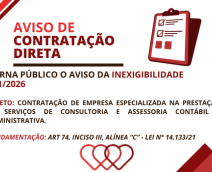 Torna-se público que o INSTITUTO DE PREVIDÊNCIA MUNICIPAL DE TRÊS CORAÇÕES – IPRECOR, realizará INEXIGIBILIDADE, com critério de julgamento Notória especialização, na hipótese do art. 74, inciso III, alínea "c" nos termos da Lei n.º 14.133, de 1º de abril de 2021, do Decreto Municipal n° 5.124/2024 e demais normas aplicávei, para Contratação de empresa especializada na prestação de serviços de consultoria e assessoria contábil e administrativa, para o Instituto de Previdência Municipal de Três Corações – IPRECOR